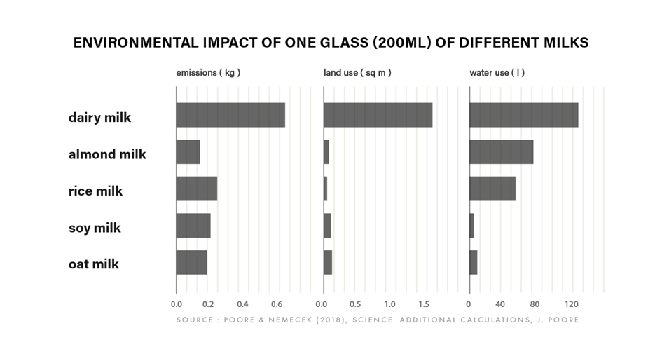 Sırasıyla hayvansal süt, badem sütü, pirinç sütü, soya sütü ve yulaf sütü karşılaştırması. Karşılaştırılan konular ise 200 Ml süt üretimi için sırasıyla emisyon, arazi kullanımı ve su kullanımı.